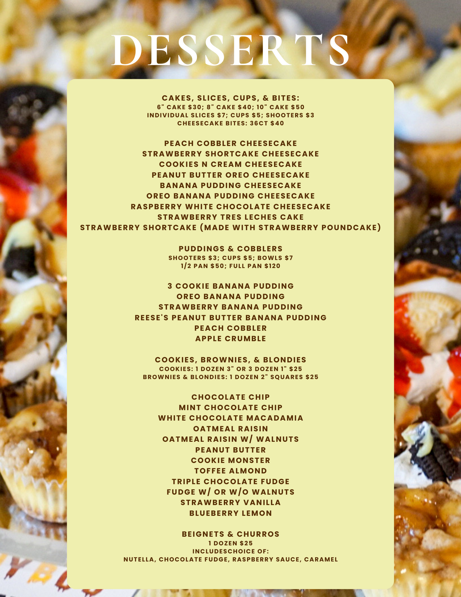 Sweeten any occasion with our handcrafted desserts—rich cheesecakes, irresistible puddings, fresh-baked cookies, and more. Perfect for sharing… or keeping all to yourself!